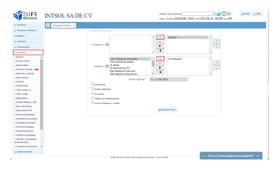Ruta: Modulo Reportes > Resumen Nómina